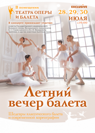 28, 39, 30 июля на одной сцене встретятся исполнители мирового уровня, отражающие творческие тенденции классического и современного мирового балетного искусства на «Летнем вечере балета».