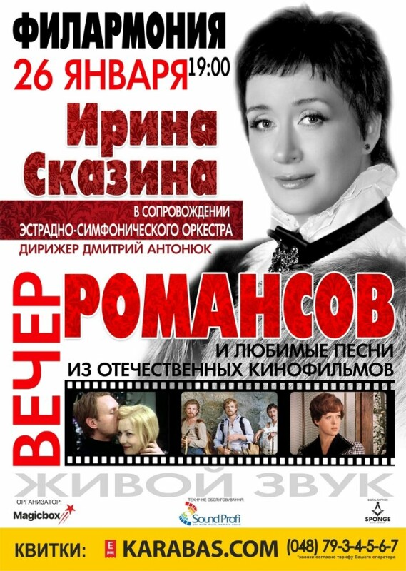 Прекрасный зал одесской Филармонии, великолепный оркестр и удивительная Ирина Сказина подарят зрителям душевное тепло в этот январский вечер! Ждём Вас!