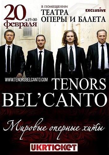 В концертной программе прозвучат популярные мировые хиты, шедевры оперной музыки, в исполнении золотых голосов «Tenors BEL'CANTO» в абсолютно живом звучании!