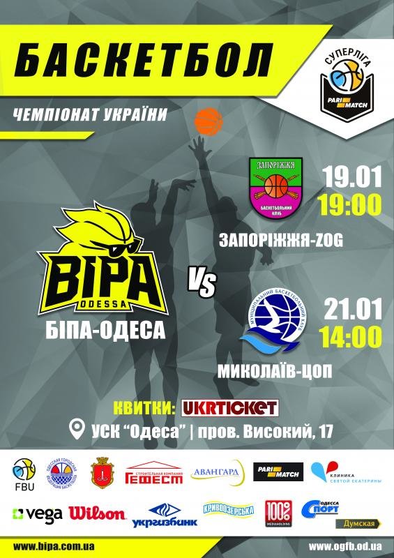 19-го и 21-го января в УСК «Одесса» будут сыграны очередные матчи чемпионата Украины по баскетболу Суперлиги Пари-Матч сезона 2017/18. В пятницу «БИПА-Одесса» сыграет с БК «Запорожье-ZOG», в воскресенье – с МБК «Николаев».