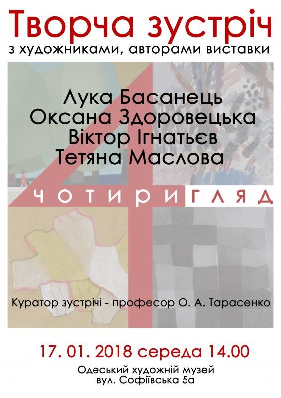 Приглашаем вас на творческую встречу с художниками, авторами выставки "Чотиригляд" : Лука Басанец, Оксана Здоровецкая, Виктор Игнатьев, Татьяна Маслова . Куратор встречи - профессор О. А. Тарасенко. Встреча состоится 17.01.2018 (среда) в 14.00 в выставочных залах Одесского художественного музея по адресу: ул. Софиевская , 5а.