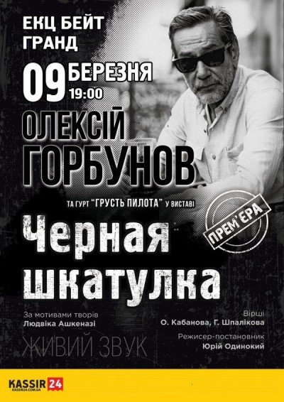 9 марта 2018 года, в зале ЕКЦ Бейт Гранд, театр «На Нежинской», украинский актер театра и кино Алексей Горбунов соберет вокруг себя неравнодушных к искусству людей. Кроме того, в творческом вечере харизматичного Народного артиста Украины примет участие группа «Грусть пилота», которая добавит спектаклю необходимой мелодичности. Всё действие, происходящее на сцене, объединено общим названием: «Черная шкатулка», в честь произведения Людвика Ашкенази.