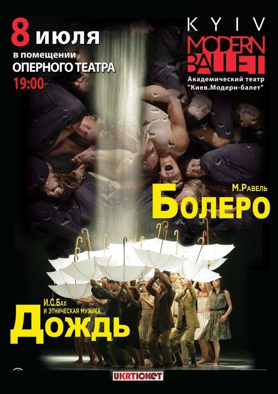 «Дождь» - философский рассказ о судьбах людей, помимо своей воли объединённых в одном времени и пространстве. Этническая музыка и контрастная ей музыка И.С. Баха, словно голоса говорящих на разных языках людей, служат великолепной рамой для хореографии.