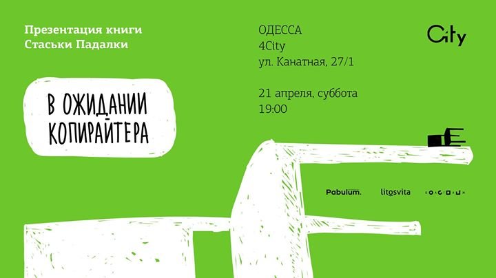 21 апреля в 19:00 в 4City (ул. Канатная, 27/1) Стаська Падалка презентует книгу «В ожидании копирайтера». Вход свободный.