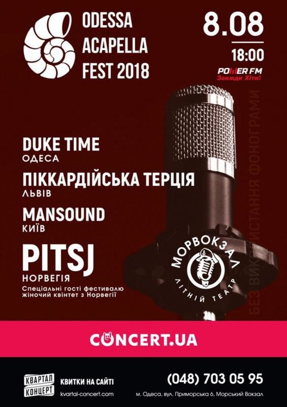 8 августа в Одессе впервые на одной сцене соберутся три ведущих мужских вокальных бренда Украины, чтобы открыть новую фестивальную историю - первый международный акапельный фестиваль Odessa Acapella Fest. Фестиваль объединит Запад, Центр и Юг Украины - Пиккардийская терция (Львов), ManSound (Киев), Duke-Time (Одесса). Разбавит мужскую компанию специальный гость из Норвегии - женский квинтет PITSJ (Осло).