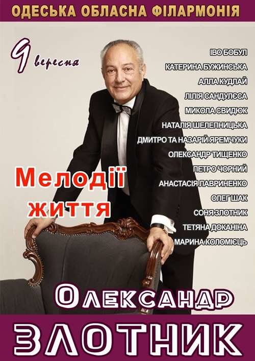 В одесской областной филармонии состоится творческий вечер Народного артиста Украины, Заслуженного деятеля искусств, композитора Александра Злотника. На его счету около 2000 написанных эстрадных песен и около 100 для кинофильмов. Его песни на протяжении многих лет исполняют популярные артисты — Валерий Леонтьев, София Ротару, Виталий и Светлана Билоножко, Иосиф Кобзон, Вахтанг Кикабидзе, Павло Зибров, Екатерина Бужинская, Тамара Гвардцителли. Иво Бобул, Алла Кудлай и многие не менее популярные исполнители. Написал музыку для нескольких мюзиклов, симфонических и камерных оркестров. Единственный в Украине композитор, который удостоен в Швейцарии «Большой Золотой медали Всемирной организации интеллектуальной собственности».