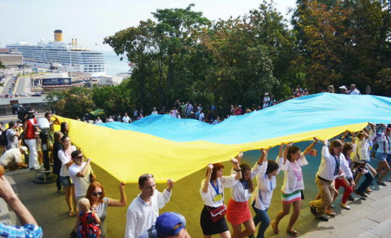 В День Государственного Флага Украины, на Потемкинской лестнице развернут 27-метровый государственный символ Украины.