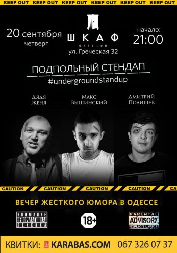 Тогда, именно для Вас в Одессе, в арт-клубе ШКАФ, самый смешной, самый яркий, самый масштабный и самый дерзкий стендап-проект страны – Подпольный Стендап! Для этих комиков нет запретных тем и табу! Такой откровенный юмор – не увидишь по ТВ! Приходите в культовый одесский арт-клуб Шкаф! И прежними вы уже не будете!