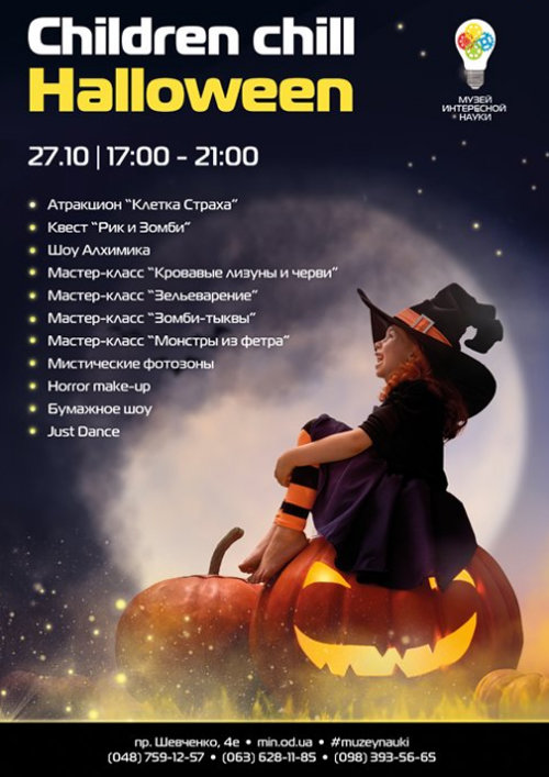 Многие родители игнорируют празднование Halloween из-за мрачной, местами жутковатой, атмосфер. Для того, чтобы раз и навсегда развеять эти ассоциации, Музей Интересной Науки подготовил невероятную вечеринку для всей семьи! Прямо у входа вас ждет бесплатный аквагрим, а в течении всего вечера вы сможете: научиться варить зелья, изготавливать кровавых лизунов и вырезать из тыквы потрясающие фигуры; побывать в лаборатории настоящего алхимика; отправится в путешествие вместе с Морти и его сумасшедшим дедулей Риком; повеселиться на настоящей Monster party; сделать крутые снимки в специальных фотозонах; И не забудьте про конкурс на самый жутко красивый костюм. Ежегодная вечеринка Children chill— прекрасная возможность развеять свои страхи и превратить празднование Halloween в сплошное веселье! 27 октября 17:00 — 21:00. Для всей семьи Входной билет Предпродажа: с 01.10 по 15.10 — 130 грн/чел; с 15.10 по 25.10 — 150 грн/чел В день мероприятия: 170 грн/чел (взрослые и дети в тематических костюмах); 200 грн/чел ( дети); 170 грн/чел ( взрослые) пр-т. Шевченко, 4е У вас есть вопросы? Звоните и мы с радостью на них ответим: +38 (048) 759-12-57; +38 (063) 628-11-85; 098 393-56-65Будет жутко весело и страшно интересно!