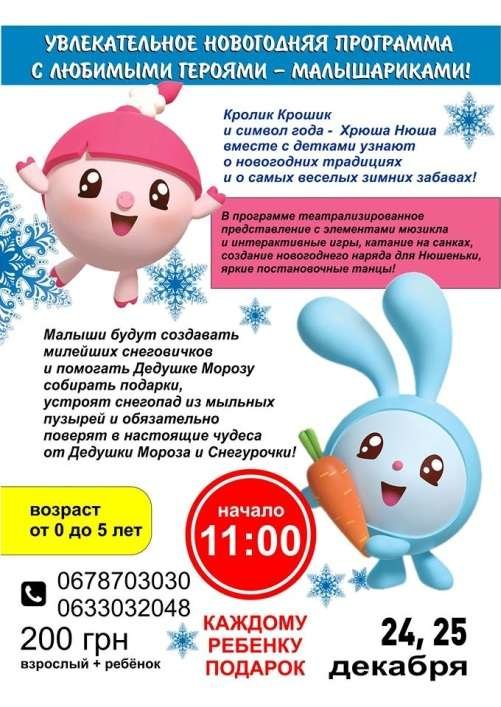 Увлекательная новогодняя программа с любимыми героями - Малышариками! Кролик Крошик и символ года - Хрюша Нюша вместе с детками узнают о новогодних традициях и о самых веселых зимних забавах! В программе театрализированное представление с элементами мюзикла и интерактивные игры, катание на санках, создание новогоднего наряда для Нюшеньки, яркие постановочные танцы! Малыши будут создавать милейших снеговичков и помогать Дедушке Морозу собирать подарки, устроят снегопад из мыльных пузырей и обязательно поверят в настоящие чудеса от Дедушки Мороза и Снегурочки!