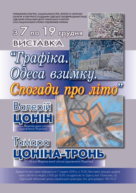 7 декабря 2018 в 15.00 в выставочном зале Одесского областного центра украинской культуры состоится открытие выставки «Графика. Одесса зимой. Воспоминания о лете »членов Национального союза художников Украины Валерия Цонина и Тамары Цонинои-Тронь.