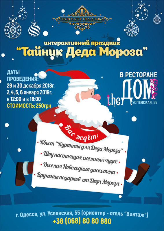 Интерактивный праздник "Тайник Деда Мороза" В Новый год в Одессе Дед Мороз живет в тайной резиденции, которая, как говорят, находится в QUEST RM, который в ресторане "The Дом". Приглашаем вас в наше новогоднее приключение в квест комнату, в которой именно вы поможете отыскать нам путь к тому самому тайнику. В награду нашим трудам станет - незабываемое шоу снежных чудес, веселая новогодняя дискотека и... и конечно же подарки!
