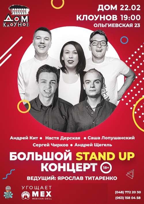Приглашаем вас на БОЛЬШОЙ STAND UP КОНЦЕРТ, где мы собрали для вас комиков со всей Украины. Отборные шутки от лучших представителей разговорного жанра, вечер смелой и откровенной стендап комедии .