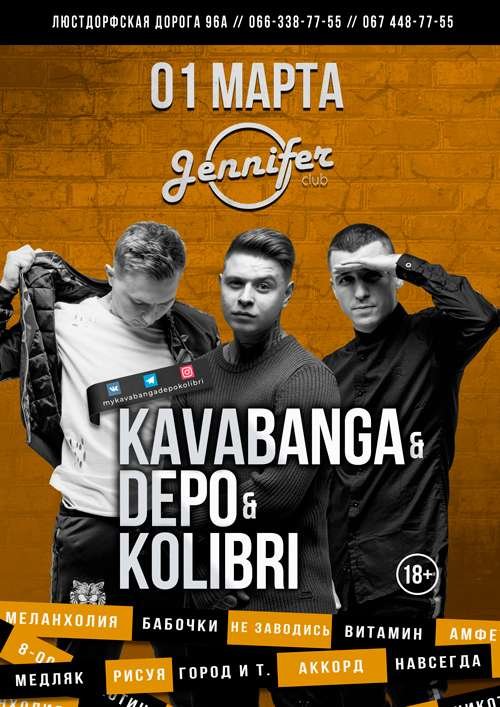 Kavabanga Depo Kolibri - один и самых нашумевших boyz band Украины. Три талантливых парня из Харькова вопреки всем "продюсерским" законам шоу бизнеса вот уже 5 лет покоряют без преувеличения все музыкальные площадки своими молодёжными хитами. Залог успеха коллектива в смысле и искренности их рифм, а также в мелодичности голосов каждого из участников. Разный стиль исполнения каждого из KDK - формирует действительно уникальный формат лирического хип-хопа с элементами Pop, R'n'B, Reggae, Trap. KDK не перестают удивлять своих слушателей, выпуская каждый год новые альбомы, и синглы. Каждый год коллектив даёт больше сотни концертов в странах СНГ и Европы, их социальные сети насчитывают сотни тысяч подписчиков, клипы набирают миллионы просмотров, а их аудитория - постоянно растёт. 1 марта Kavabanga Depo Kolibri посетят Одессу Большой концерт состоится в ночном клубе “JENIFER” Программа: большая шоу программа + все хиты