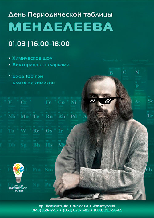 150 лет Периодической таблице Менделеева. А вы знали, что 2019-й объявлен Международным годом Периодической таблицы?1 марта, труду Д.И. Менделеева исполняется целых 150 лет.В честь этого, Музей Интересной Науки подготовил научную шоу-программу с яркими химическими экспериментами и викторину с подарками. А самых преданных фанатов химии, в этот день, ждет приятная скидка на вход. Всем, кто любит химию Стоимость: 160 грн. Специальная цена — 100 грн при условии решения задания по химии. Место проведения: пр.Шевченко, 4еСправки по телефонам: 048 759-12-57; 063 628-11-85; 098 393-56-65.