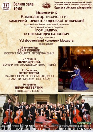Абонемент №12 «Композитор тысячелетия». Камерный оркестр Одесской филармонии, художественный руководитель и главный дирижер - заслуженный артист Украины Игорь Шаврук, и Александра Сапсович представляют: «Все фортепианные концерты Моцарта». Вечер третий: 23 концерт. «С небом наедине». (Памяти М. Петрова).