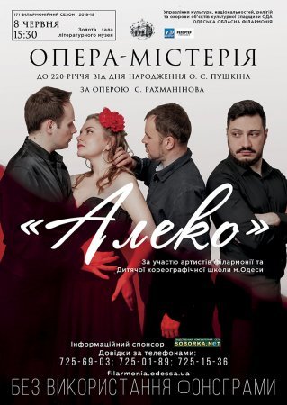 «Алеко». Опера-містерія. До 220-річчя від дня народження О.С.Пушкіна за оперою С.Рахманінова. За участю артистів філармонії та Дитячої хореографічної школи м.Одеси.