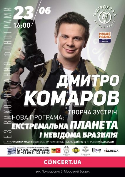 Эти и множество других захватывающий историй Дмитрий Комаров впервые расскажет на мастер-классе в Одессе, 23 июня.Дмитрий Комаров поделится эксклюзивными подробностями новых приключений команды «Мир наизнанку» в Бразилии, которые еще не видели зрители.