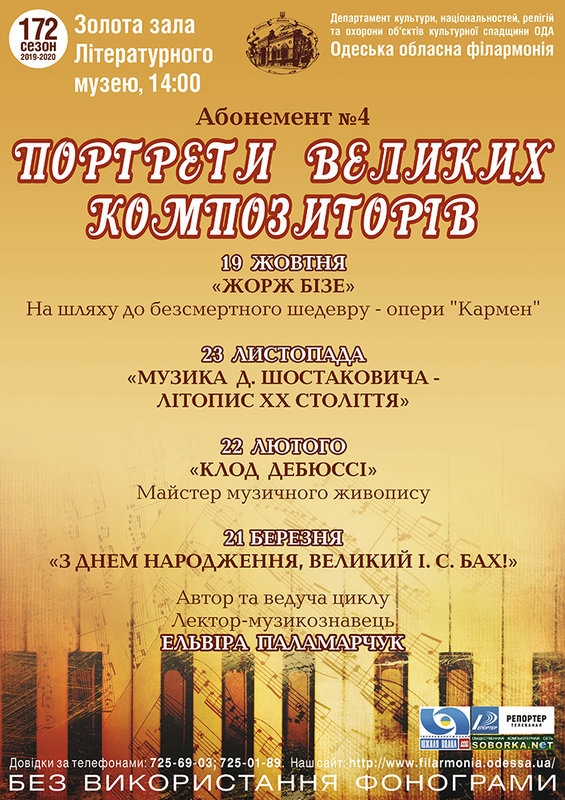 В этом филармоническом сезоне, автор и ведущая цикла, лектор-музыковед Эльвира Паламарчук, с лучшими солистами Одесской филармонии, будут создавать творческие портреты композиторов мировой классики. Это: Жорж Бизе, Дмитрий Шостакович, Клод Дебюсси, Иоганн Себастьян Бах.