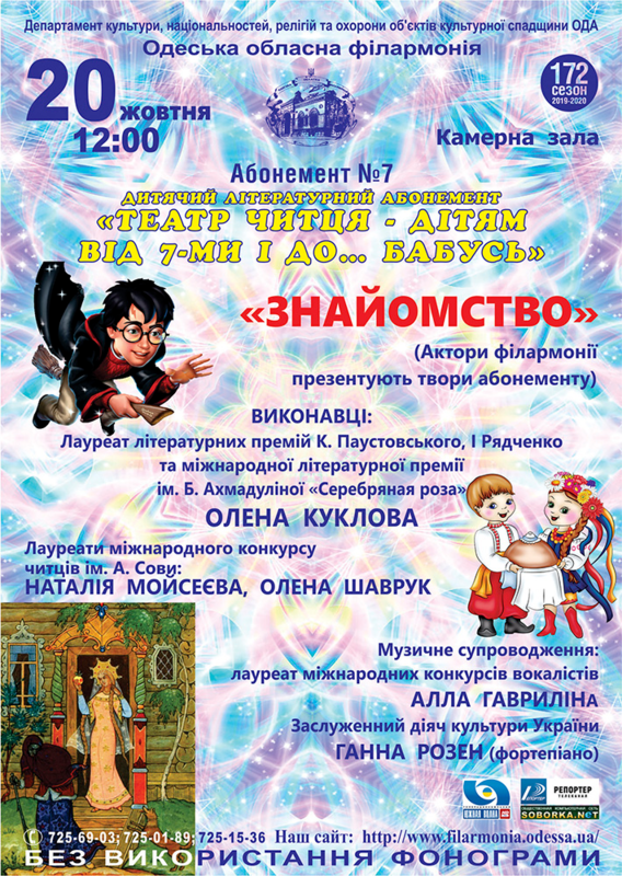 Абонемент №7 детский литературный «Театр чтеца - детям от 7-ми и до ... бабушек». «Знакомство». Актеры филармонии представят произведения абонемента.