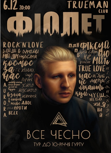 10 лет искренней музыки, новых стран и городов, десятки песен, сотни сцен и тысячи счастливых лиц напротив. Но мы не останавливаемся: Фиолет отправляется в юбилейный тур до десяти группы! Презентация нового мини-альбома «Все честно», программа из лучших песен, неповторимые шоу и специальные гости - не упусти один из особых вечеров в своем городе! Космос будет за нас!