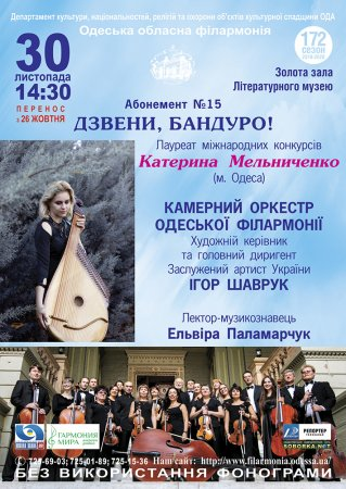 Лауреат международных конкурсов Екатерина Мельниченко (Одесса), Камерный оркестр Одесской филармонии, худоднй руководитель и главный дирижер - зслужений артист Украины Игорь Шаврук (г.Одесса). Лектор-музыковед Эльвира Паламарчук.