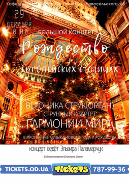 Подарком для гостей станет большой концерт «Рождество в европейских столицах / Орган и «Гармонии Мира» в исполнении Вероники Струк ( орган ) и струнного квартета «Гармонии мира» Концерт ведёт Эльвира Паламарчук.