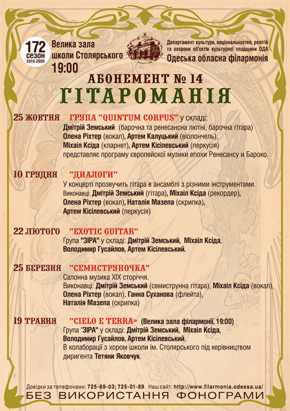 Программа Exotic Guitar будет представлена группой «ЗИРА» и струнным квартетом. За фортепиано – В. Демидова. На концерте прозвучат также скрипка, виолончель, кларнет, бас, альт, контрабас и, конечно же, гитара.