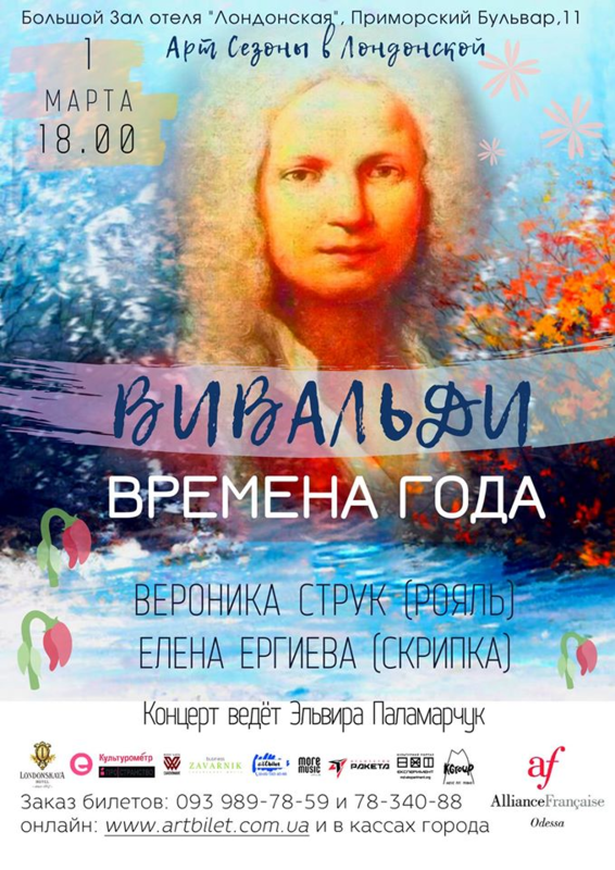 В этом концерте великое сочинение Вивальди прозвучит в исполнении блистательной Вероники Струк ( рояль) и солирующей скрипки Елены Ергиевой. Концерт ведёт Эльвира Паламарчук.