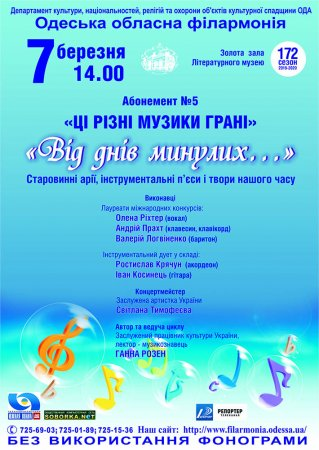 Абонемент №5 «Эти разные музыки грани». «От дней минувших ...» Древние арии, инструментальные пьесы и произведения нашего времени.