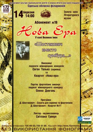 Абонемент №19 «Новая Эра». В кругу Великих имен. «Шостакович вместо сумбура ...» Исполнители - лауреаты международных конкурсов: Е.Талько (скрипка) и Квартет «Новая эра». Партию фортепиано исполняет лауреат международного конкурса О.Довгань. Лектор-музыковед С.Грекул.