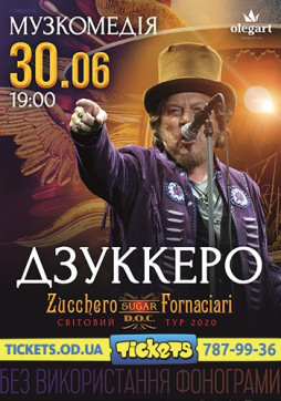 За время своей карьеры (а длится она вот уже три десятилетия) Zucchero сотрудничал с самыми известными музыкантами современности. Сам Эрик Клэптон исполнил соло на гитаре и партию бэк-вокала в композиции Zucchero «Wonderful world». Стинг, Джо Кокер, Лучано Паваротти, Пол Янг, Боно, Андреа Бочелли считают за честь поработать с этим разноплановым исполнителем, способным одинаково виртуозно исполнять блюз, джаз и популярную музыку.Zucchero был номинирован на премию «Грэмми», получил две статуэтки World Music Awards, четыре награды Festivalbar и шесть наград Wind Music Awards.На счету музыканта – 20 выпущенных дисков. В 1987 году альбом «Blue’s» сделал из Zucchero мегазвезду. В одной только Италии было раскуплено1 млн 300 тыс копий этого диска. Залогом невероятного успеха альбома стали композиции, которые впоследствии обрели мировую славу, –«Bambino io, bambino tu (Legenda)», «Hey man», «Con le mani».Другой его альбом – «Oro incenso e birra» – разошелся тиражом более 8 млн экземпляров и долгое время считался самым продаваемым альбомом во всем мире.В 1989 году Zucchero написал саундтрек к фильму «Snack Bar Budapest», а спустя два года попал на вершину британских и европейских чартов с синглом «Senza una donna», который исполнил в дуэте с Полом Янгом.В 2000 году Zucchero принял участие в международном благотворительном гала-концерте Лучано Паваротти в Ганновере, где выступил в качестве специального гостя в составе Scorpions и Берлинского филармонического оркестра.Был приглашен Zucchero и на торжество по случаю 91-летия экс-президента ЮАР Нельсона Манделы. Музыкант спел свой хит «You are so beautiful» на концерте «46664 Make An Imprint», который состоялся в мюзик-холле Radio City вНью-Йорке. Вместе с Zucchero на одной сцене также выступали Стиви Уандер, Дэйв Стюарт, Уиклеф Джин, Алиша Киз, Вупи Голдберг, Форест Уитакер, Морган Фримен…В 2004 году Zucchero выпустил альбом «Zu & Co», в котором все песни записаны в дуэте со знаменитостями. Созданию этого диска музыкант посвятил шестнадцать лет своей жизни. В 2015 году солист группы U2 Боно пригласил Zucchero выступить на концерте U2 в Pala Alpitour в Турине.В апреле прошлого года Zucchero выпустил альбом «Black Cat» (Universal Music Group). В поддержку этого диска артист отправился в мировой тур, с которым объездил США, Австралию, Новую Зеландию, Японию и другие страны. В сентябре 2017 очередь дойдет и до Украины! В программу тура «Black Cat» войдут как новые композиции, так и бессмертные хиты Zucchero, благодаря которым его по сей день считают самым известным музыкантом планеты!Подарите себе и своим близким вечер прекрасной музыки, которая останется в памяти на всю жизнь! Такое шоу невозможно пропустить!