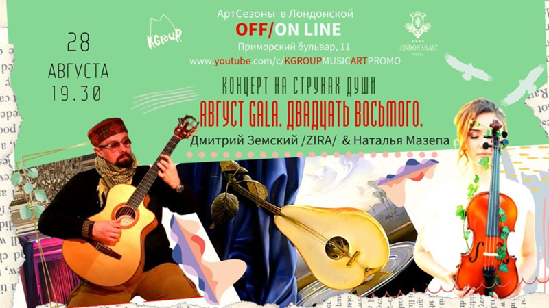 Мелодичные сюжеты Пьяцоллы, Паганини, Джулиани и их современников расскажут виртуозная скрипка лауреата международных конкурсов Натальи Мазепы и солирующая гитара лауреата международных конкурсов, композитора, мультиинструменталиста Дмитрия Земского, известного по проектам ZIRA, Quintum Corpus, а также по многочисленным концертам в одесской филарамонии и на международных фестивалях.