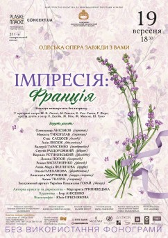 Программа концерта:1. Ж. Б. Люлли - «Марш для турецкой церемонии». Исполняют А. Анисимов, М. Тихоплав, С. Сагдеев, А. Лысюк, В. Тарасенко, С. Раздорожный. 2. Л. Делиб - «Дуэт цветов» из оперы «Лакме». Исполняют А. Мартынюк, А. Ткачук, О. Плеханова. 3. М. Равель - «Болеро» (аранжировка М.Гринивецкой) Исполняют А. Анисимов, М. Тихоплав, С. Сагдеев, А. Лысюк, К. Устиновский, Л. Попов, С. Раздорожный, А.-М. Филиппова. 4. Ш. Гуно - ария Ромео из оперы «Ромео и Джульетта». Исполняют засл. артист Украины В. Горай, А. Плеханова. 5. Ж. Бизе - ария Микаэлы из оперы «Кармен». Исполняют А. Ткачук, О. Плеханова. 6. Ж. Массне - ария Вертера из оперы «Вертер». Исполняют засл. артист Украины В. Горай, А. Плеханова. 7. К. Сен-Санс - «Лебедь» из цикла «Карнавал животных». Исполняют А. Лысюк, А.М. Филиппова. 8. Ж. Бизе - хабанера из оперы «Кармен». Исполняют А. Мартынюк, А. Плеханова. 9. Ш. Гуно - ария «Salut demeure chaste et pure» из оперы «Фауст». Исполняют засл. артист Украины В. Горай, А. Плеханова. 10. Г. Форе - «Павана». Исполняют А. Анисимов, М. Тихоплав, С. Сагдеев, А. Лысюк, В. Тарасенко, К. Устиновский, Л. Попов, Г. Васильченко, А. М. Филиппова.