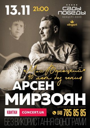 13 ноября в концерт-холле «Сады Победы» Арсен Мирзоян представит программу под названием «Мой Высоцкий», посвященную гению. Идея реализовать этот проект у артиста возникла давно. «Я познакомился с творчеством Владимира Семеновича еще в детстве, - вспоминает Арсен Мирзоян. - Тогда у нас дома был старый проигрыватель и начали появляться винилы. Они были коротенькие, мы их слушали, изучали наизусть. Впоследствии я пел услышанные песни под гитару во дворе. Пою их до сих пор в кругу друзей. А теперь еще и спою на концерте памяти».
