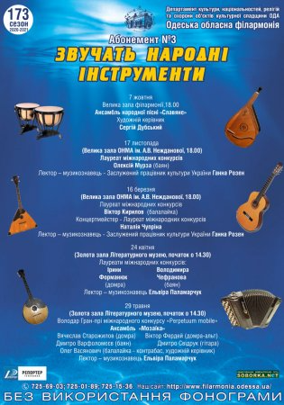 Абонемент №3 «Звучат народные инструменты». Лауреат международных конкурсов Алексей Мурза (баян). Лектор-музыковед - заслуженный работник культуры Украины Анна Розен.