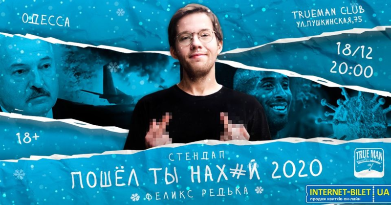 2020 прошел тяжело. Пандемия коронавируса, авиакатастрофы, протесты, религиозные конфликты и т.д. Стендап-комик Феликс Редька едет в новогодний тур по стране, чтобы вместе со зрителями спустить пар, посмеяться и торжественно послать нах # й этот год.Феликс участник множества юмористических шоу ("Рассмеши комика", "Комик на миллион", "Лига смеха"), автор проекта "Мэр Сум Анатолий Почечун", а самое главное опытный украинский стендап-комикПрограмма будет состоять из приглашенного гостя, импровизации и лучших шуток не опубликованных в сети.