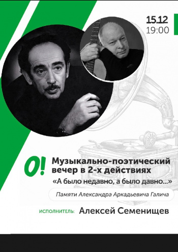 Музыкально-поэтический спектакль памяти Александра Галича «А было недавно, а было давно…» в исполнении Алексея Семенищева на нашей сцене! Бардовская песня началась с Галича. Потом были Высоцкий, Окуджава, Визбор.. Авторская песня стала обычным явлением. А имя и творчество Галича попали под запрет вплоть до перестройки. Он шел до конца, называя вещи их именами там, где другие обходились метафорой. В этот вечер Алексей Семенищев исполнит бессмертные песни и прочитает стихотворения Александра Галича, а также поближе познакомит вас с биографией сценариста, драматурга и поэта. Приглашаем провести этот вечер с нами!