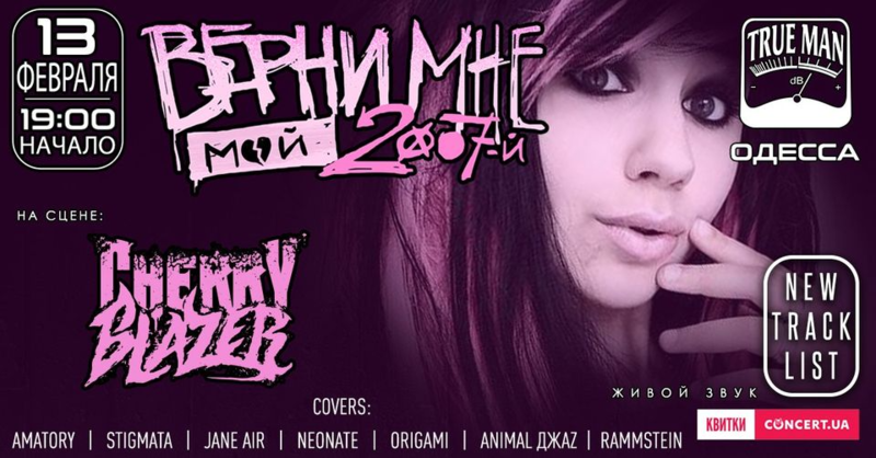 Адепты 2007 года, группа CherryBlazer, едет в тур по Украине с абсолютно новой программой. Как говорится, где сентябрь горел, там убийца плакал. Черно-белой краской он все заляпал. Вас ждет обновленная программа каверов, прямиком из родного 2007 года, которая порадуют многих фанатов! ПОЧЕМУ СТОИТ ПОЙТИ НА КОНЦЕРТ ВЕРНИ МНЕ МОЙ 2007? 1. Вернуть себе свой 2007 и окунуться в ностальгическую атмосферу молодости.2. Послушать кавера в отличном качестве на группы: Amatory, Stigmata, Jane Air, Origami, Animal Джаz, NeoNate, Тонкая Красная Нить, Rashamba и многие другие популярные группы тех времен (новый трек лист!)3. Изюменкой программы станут кавера на RAMMSTEIN.