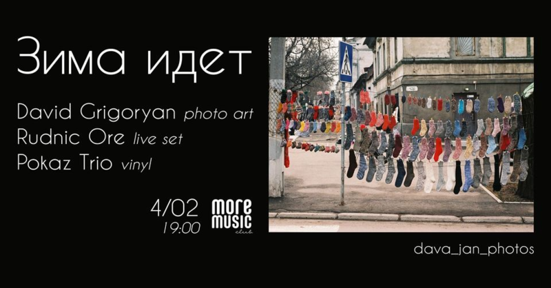 4 февраля в More Music Club пройдет выставка работ одесского фотографа Давида Григоряна «Зима идет». Музыкальные гости вечера — Rudnic Ore. «Представляю серии зимних кадров, снятых во время моих передвижений в разных местах, по поводу и без. Я не любитель зимы, но местами она дарит картинки, создающие атмосферу уюта, внутреннего спокойствия и некой теплоты. Приглашаю тебя в визуальное путешествие по зимам Норвегии, Грузии, Армении, и конечно же Одессы. Период съёмки 2010-2018 гг» (с)