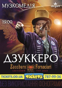 За время своей карьеры (а длится она вот уже три десятилетия) Zucchero сотрудничал с самыми известными музыкантами современности. Сам Эрик Клэптон исполнил соло на гитаре и партию бэк-вокала в композиции Zucchero «Wonderful world». Стинг, Джо Кокер, Лучано Паваротти, Пол Янг, Боно, Андреа Бочелли считают за честь поработать с этим разноплановым исполнителем, способным одинаково виртуозно исполнять блюз, джаз и популярную музыку.Zucchero был номинирован на премию «Грэмми», получил две статуэтки World Music Awards, четыре награды Festivalbar и шесть наград Wind Music Awards.На счету музыканта – 20 выпущенных дисков. В 1987 году альбом «Blue’s» сделал из Zucchero мегазвезду. В одной только Италии было раскуплено1 млн 300 тыс копий этого диска. Залогом невероятного успеха альбома стали композиции, которые впоследствии обрели мировую славу, –«Bambino io, bambino tu (Legenda)», «Hey man», «Con le mani».Другой его альбом – «Oro incenso e birra» – разошелся тиражом более 8 млн экземпляров и долгое время считался самым продаваемым альбомом во всем мире.В 1989 году Zucchero написал саундтрек к фильму «Snack Bar Budapest», а спустя два года попал на вершину британских и европейских чартов с синглом «Senza una donna», который исполнил в дуэте с Полом Янгом.В 2000 году Zucchero принял участие в международном благотворительном гала-концерте Лучано Паваротти в Ганновере, где выступил в качестве специального гостя в составе Scorpions и Берлинского филармонического оркестра.Был приглашен Zucchero и на торжество по случаю 91-летия экс-президента ЮАР Нельсона Манделы. Музыкант спел свой хит «You are so beautiful» на концерте «46664 Make An Imprint», который состоялся в мюзик-холле Radio City вНью-Йорке. Вместе с Zucchero на одной сцене также выступали Стиви Уандер, Дэйв Стюарт, Уиклеф Джин, Алиша Киз, Вупи Голдберг, Форест Уитакер, Морган Фримен…В 2004 году Zucchero выпустил альбом «Zu & Co», в котором все песни записаны в дуэте со знаменитостями. Созданию этого диска музыкант посвятил шестнадцать лет своей жизни. В 2015 году солист группы U2 Боно пригласил Zucchero выступить на концерте U2 в Pala Alpitour в Турине.В апреле прошлого года Zucchero выпустил альбом «Black Cat» (Universal Music Group). В поддержку этого диска артист отправился в мировой тур, с которым объездил США, Австралию, Новую Зеландию, Японию и другие страны. В сентябре 2017 очередь дойдет и до Украины! В программу тура «Black Cat» войдут как новые композиции, так и бессмертные хиты Zucchero, благодаря которым его по сей день считают самым известным музыкантом планеты!Подарите себе и своим близким вечер прекрасной музыки, которая останется в памяти на всю жизнь! Такое шоу невозможно пропустить!
