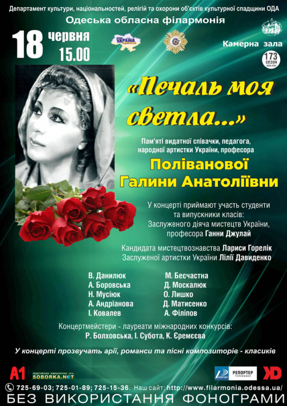 "Печаль моя светла ..." Концерт памяти выдающейся певицы, педагога, народной артистки Украины, профессора Галины Анатольевны Поливановой.