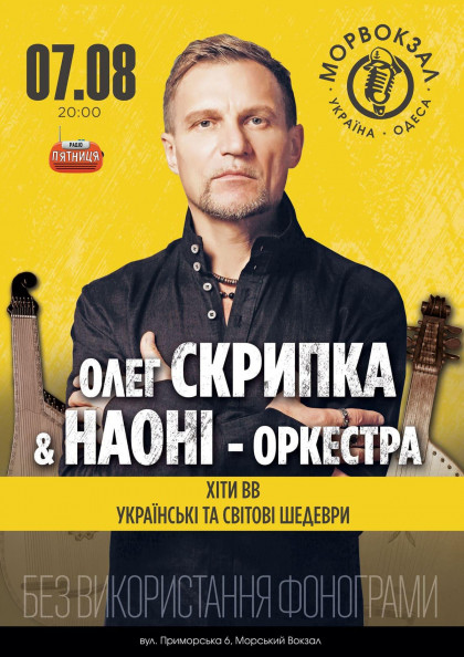 7 августа 2021 года в Летнем театре "Морвокзал" состоится концерт Олега Скрипки и НАОНИ-оркестра в Одессе с новой программой. Тандем Национального академического оркестра народных инструментов и фронтмена группы ВВ уже хорошо известен поклонникам качественной украинской музыки. Множество концертов в разных городах Украины и пять лет плодотворного сотрудничества говорят сами за себя. Стоит только вспомнить Рождественскую программу, которая с успехом гастролировала во всех городах Украины.