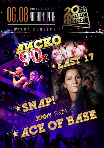 На этот раз доставайте яркие лосины, джинсы варенки и малиновые пиджаки. Всё это вам пригодится 6 августа 2021 года, когда стадион «Черноморец» в Одессе превратится в огромный танцпол! На грандиозном концерте эпохи «ДИСКО 90-х» соберутся сразу ТРИ легендарных зарубежных группы: ACE OF BASE, EAST 17 и SNAP которые подарят своей публике массу бурных эмоций и мощный заряд энергии. Да! - это не фейковые составы групп и не«кавер-группы», а те самые настоящие, оригинальные артисты, покорившие нас в 90-х будут весь вечер выступать для Вас на Стадионе «Черноморец»6 августа 2021 года.