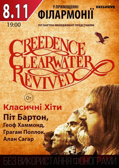 8 ноября 2021 года впервые прозвучат самые отборные произведения знаменитых Creedence Clearwater Revival на сцене Областной филармонии в Одессе. Группа, завоевавшая уже на первых этапах своего творческого взлета в 1970 году титул «Лучшей группы мира», вновь оживет в своих знаменитых известных хитах и максимально аутентичном исполнении. Собравшиеся еще 1967 году в своем первоначальном составе они подарили миру в дальнейшем полностью новый жанр свамп-рока. Ныне они возвращаются к нам в лице их вокалиста из туров времен возрождения группы Пита Бартона и его олдскульных соратников по сцене.