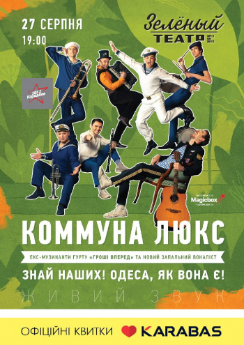 27 августа легендарный кооператив «Деньги Вперед» в новом амплуа споет Вам за всю Одессу-Маму.Музыка из самого сердца южного города, объездив добрую половину земного шара, снова играет у себя дома!Солнце, вода и медные трубы - и напевы с каждого углу вашего детства.Приготовься к большому геволт! Банда семи сделает вам громко и весело!А если не верите, пойдите и спросите!Раз в тысячу лет - Коммуна Люкс - под сенью самого зеленого амфитеатра Одессы!