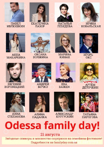 Отдохни всей семьей 21 августа на семейном фестивале Odessa family day.В течении всего дня вас ждут: медийные люди - известные спикеры, телеведущие, бизнесвумен, заслуженные артисты Украины.