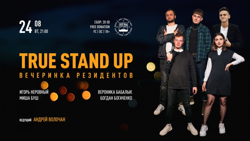 True StandUp Club представляет вечеринку резидентов! В это раз для вас - комедийных гурманов, мы подготовили: Вероника Бабалык Богдан Богаченко Миша Буш Игорь Неровный