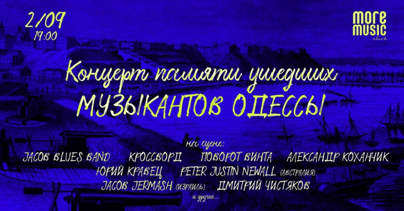 2 сентября в More Music Club пройдет концерт памяти ушедших музыкантов Одессы. В программе: Jacob Blues Band, Кроссворд, Поворот Винта, а также Александр Коханчик, Peter Justin Newall (Австралия), Jacob Jermash (Израиль), Дмитрий Чистяков, Юрий Кравец и другие. Ждем всех, кто в день рождения города хочет прикоснуться к музыке вечной!