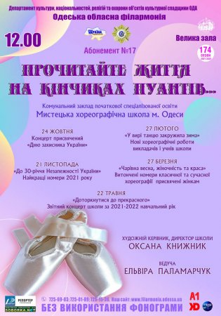 Абонемент №17 «Прочитайте жизни на кончиках пуантов ...». Художественная хореографическая школа Одессы. Концерт, посвященный «Дню защитника Украины». Художественный руководитель, директор школы Оксана Книжник, ведущая - Эльвира Паламарчук.